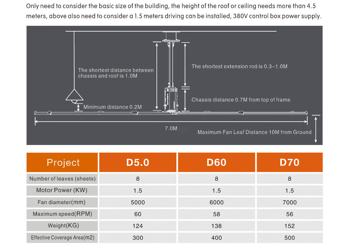 Large industrial ceiling fan has a diameter of 5-7 meters and a power of 1.5 kilowatts. It has soft wind and no noise. It can meet the indoor cooling and ventilation requirements of 200-500 square meters.
